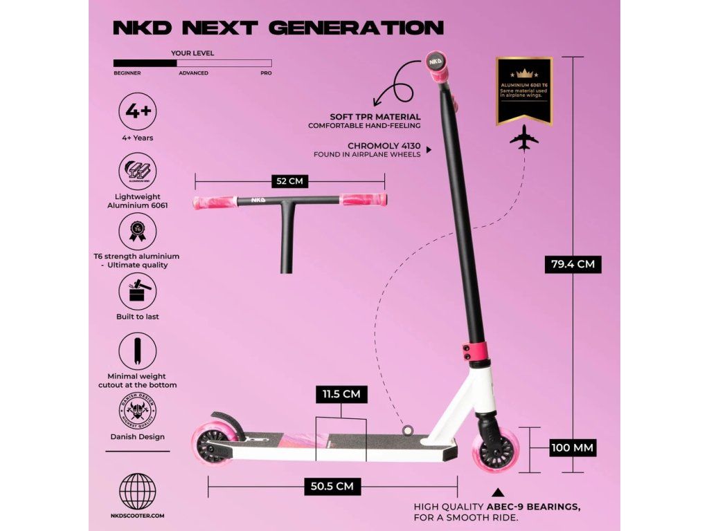 Freestyle kolobežka NKD Next Generation bola navrhnutá pre riderov, ktorí chcú jazdiť street, skúšať technické trity a postupne posúvať svoje frees. Či už vyrážaš na rampy, zábradlia alebo len piluješ svoje prvé kombinácie trikov, táto kolobežka je pripravená držať krok s tvojím progresom.
