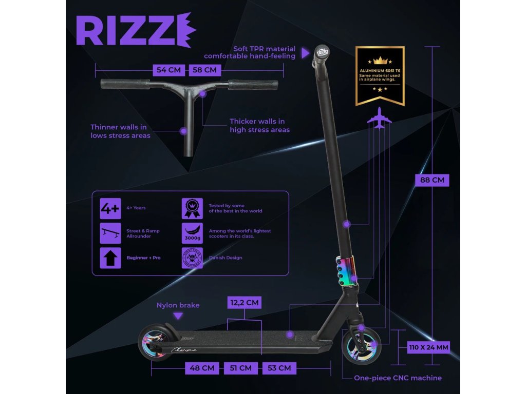 NKDSCOOTERS RIZZ „Charisma“ spája štýl, ľahkú konštrukciu a vysoký výkon. Ideálna pre jazdcov, ktorí sú pripravení ukázať svoje charisma a zručnosti. Očakávajte neočakávané – táto kolobežka posúva hranice a ohromuje dav.