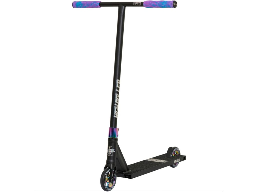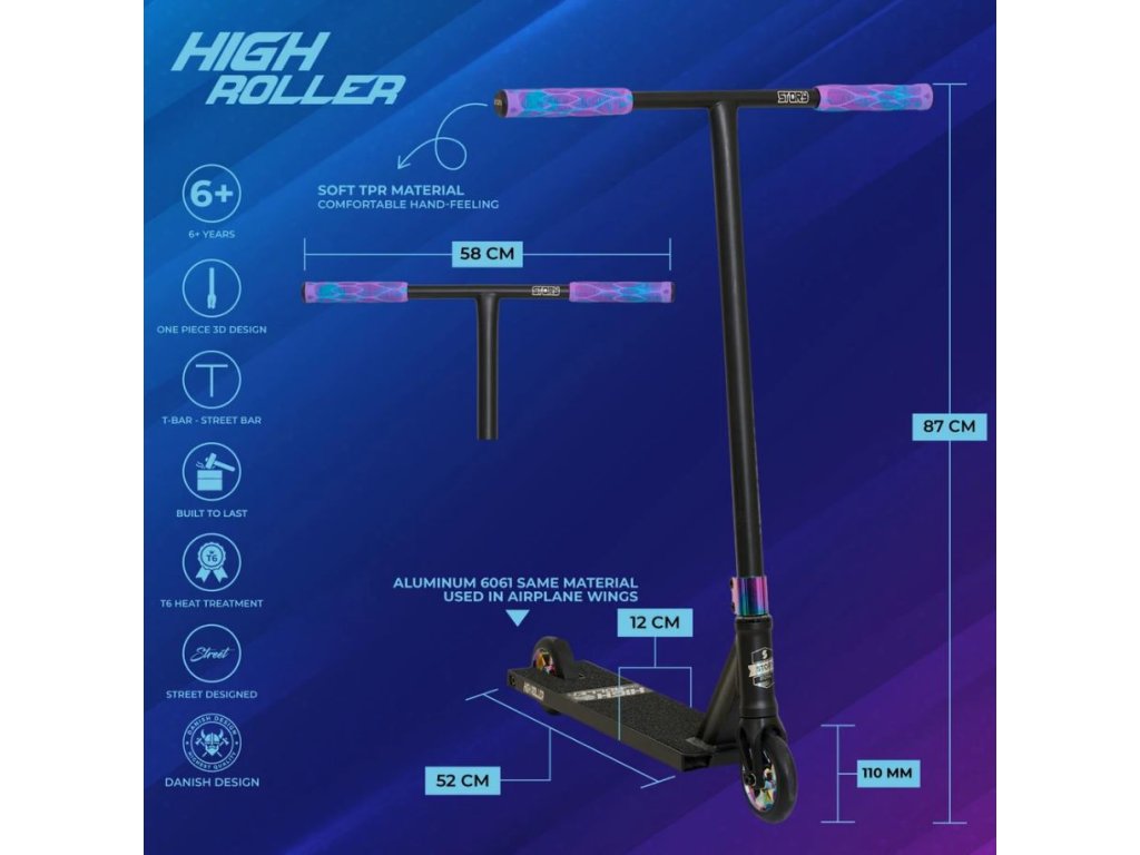 Story High Roller je triková kolobežka pre deti a mládež vo veku 7–14 rokov. Kolobežka je určená pre začiatočníkov aj skúsených jazdcov. Táto triková kolobežka je vhodná do skateparkov a ľahko kĺže. Dá sa použiť aj na presun po meste a na rôznych miestach.