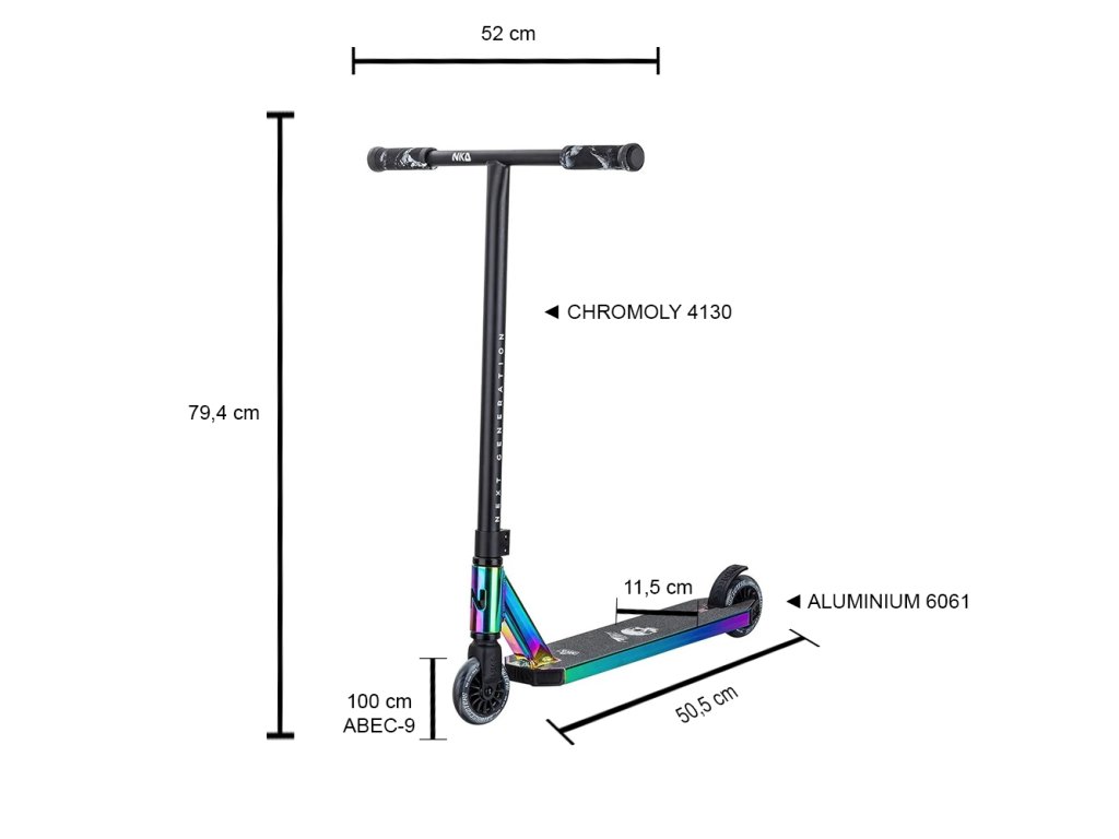 NKD dokáže spojit dohromady sílu a odolnost s nízkou hmotností. Prestižní hliník 6061 zajišťuje pevnost desky která vydrží skoky a nárazy po celý den. NKD Next Generation má silné sváry na krku, desce a hlavové tyči, takže koloběžka vydrží dlouhodobé i drsné ježdění.