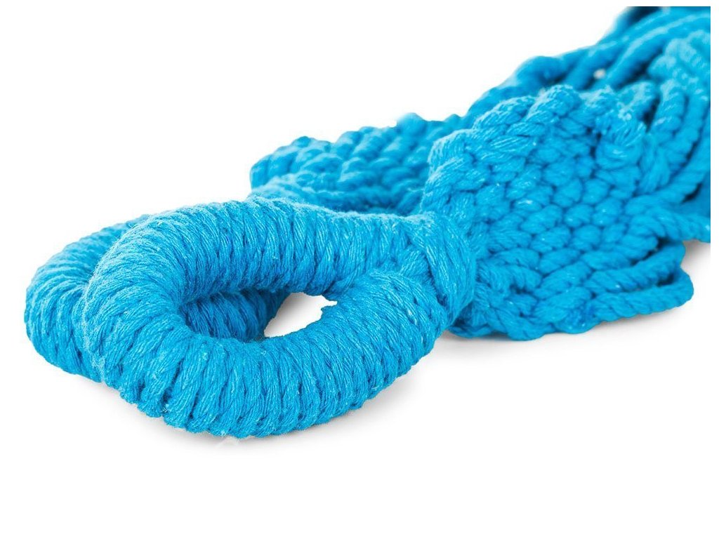 Dvojito šitá pletená hojdacia sieť s úchytmi na zavesenie alebo upevnenie. Na oboch koncoch je závesné lano spevnené. Dĺžka: 200 cm (látka) / 270 cm (so šnúrkami) x šírka 150 cm.