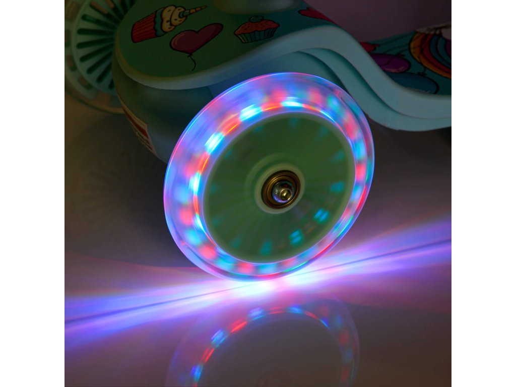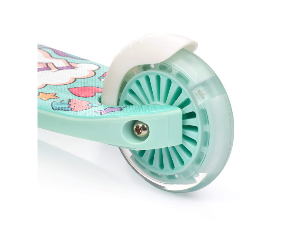 Tri tvrdé kolesá PUC vybavené ložiskami ABEC-7 zaisťujú tichú jazdu, dobrú priľnavosť k povrchu a odolnosť. Vstavané LED diódy zlepšujú viditeľnosť na ceste a zvyšujú bezpečnosť. Svietiace kolieska sú tiež atraktívnym doplnkom, ktorý upúta pozornosť každého dieťaťa. V zadnej časti kolobežky sa nachádza nožná brzda, ktorá funguje tak, že ju nohou pritlačíte k kolesu, čo výrazne maximalizuje bezpečnosť jazdy. Brzda tiež funguje ako blatník, ktorý chráni pred striekajúcou vodou.