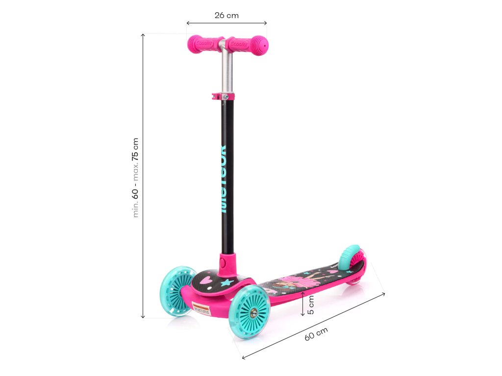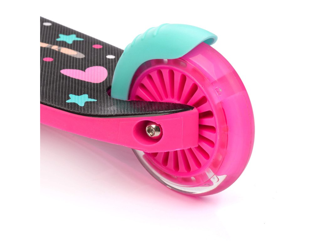 Tri tvrdé kolesá PUC vybavené ložiskami ABEC-7 zaisťujú tichú jazdu, dobrú priľnavosť k povrchu a odolnosť. Vstavané LED diódy zlepšujú viditeľnosť na ceste a zvyšujú bezpečnosť. Svietiace kolieska sú tiež atraktívnym doplnkom, ktorý upúta pozornosť každého dieťaťa. V zadnej časti kolobežky sa nachádza nožná brzda, ktorá funguje tak, že ju nohou pritlačíte k kolesu, čo výrazne maximalizuje bezpečnosť jazdy. Brzda tiež funguje ako blatník, ktorý chráni pred striekajúcou vodou.