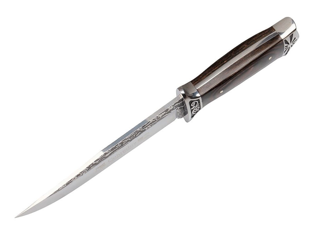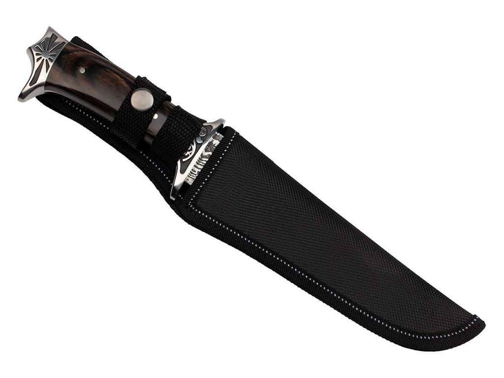 Oceľový skelet praktickej rukoväte je obložený vkusnými obkladmi. pohodlná a vďaka zdobenej záštite a hlavici, ktoré chránia ruku pred skĺznutím smerom k čepeli, je bezpečná a istá.