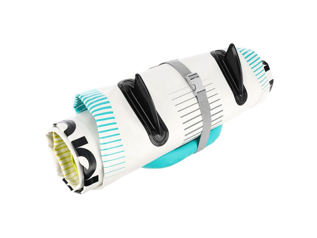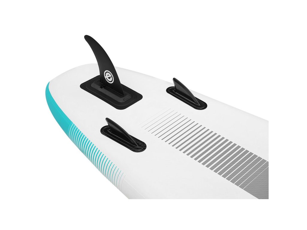 - Materiál: laminovaná PVC doska 2500 g/m2, protišmykový povrch z EVA peny, hliníkové veslá, nylon, rukoväť z TPR vesla, plutvy z PA6, polyesterový batoh