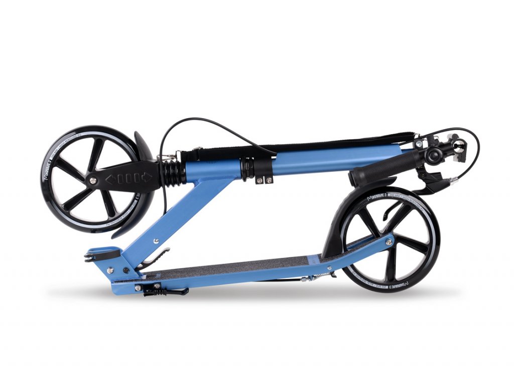 - Osobitný skladací systém s jediným tlačidlom je veľmi jednoduchý na použitie - kolobežku možno zložiť za pár sekúnd!