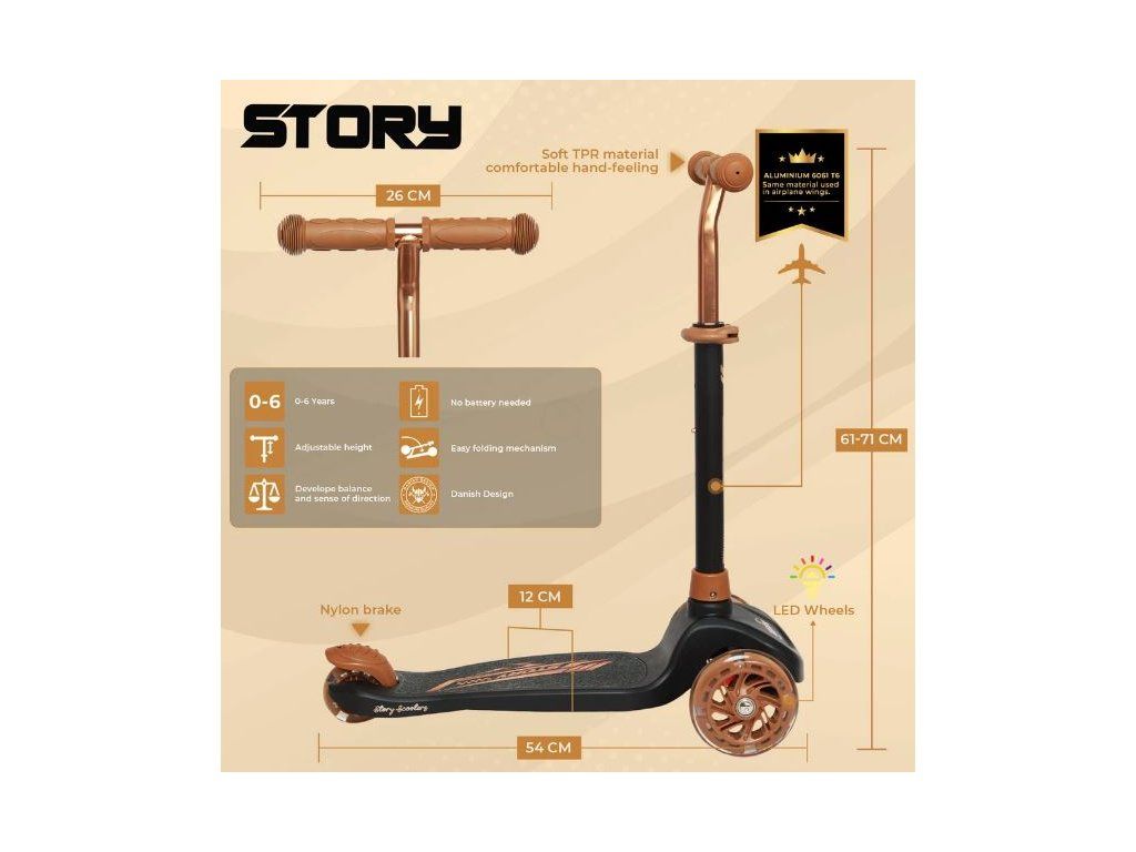 - LED svetlá v kolieskach: Story MINI je vybavená unikátnymi LED svetlami integrovanými do koliesok. Tieto svetelné efekty fungujú bez nutnosti batérií a vytvárajú sviatočnú atmosféru pri každej jazde, najmä za súmraku alebo večer.