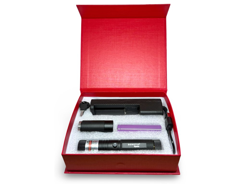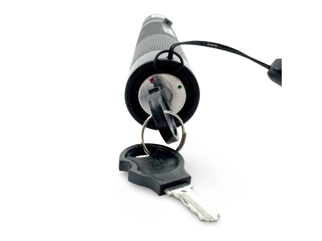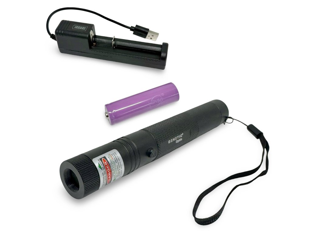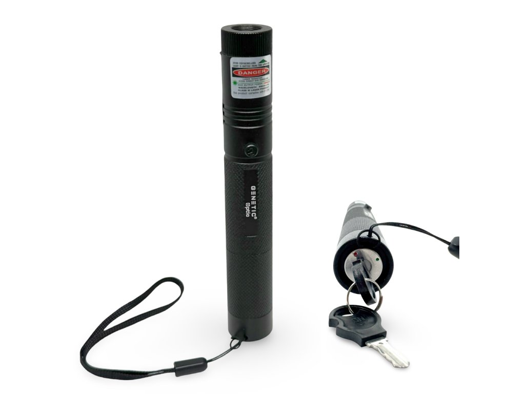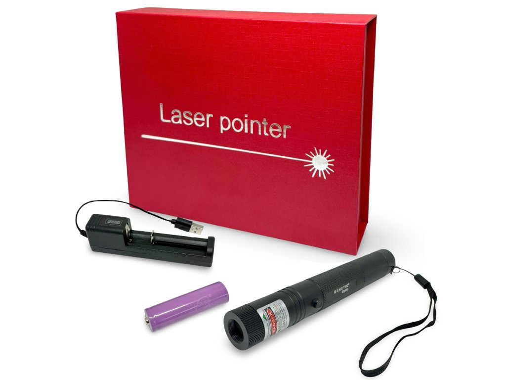 Laserový ukazovateľ s USB nabíjačkou. Laser je vyrobený z veľmi odolných materiálov, okrem iného z leteckej hliníkovej zliatiny, čo zaručuje veľmi dlhú životnosť zariadenia. Vďaka kompaktným rozmerom laserového ukazovadla aj celej sady ho možno ľahko zabaliť do kabelky, tašky, batohu alebo dokonca do vrecka. Kľúče priložené k sade slúžia na zamykanie/odomykanie laseru.