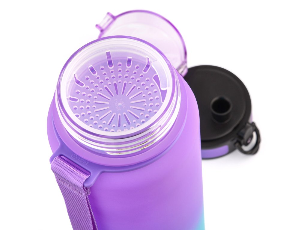 Všestranná fľaša s matným povrchom a protišmykovou úpravou je príjemná na dotyk a pútko na zápästie je pohodlné na každodenné nosenie aj na cesty. Fľaša je vybavená odmerkou na podporu pravidelnej hydratácie. Vyberateľný filter (napr. na ovocie, čaj alebo kocky ľadu) vám umožní naplniť fľašu obľúbeným nápojom bez obáv z upchatia výlevky.