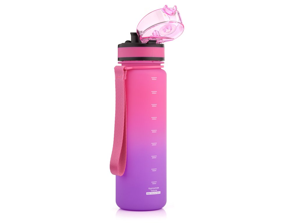 Všestranná fľaša s matným povrchom a protišmykovou úpravou je príjemná na dotyk. Pútko na zápästie je pohodlné na každodenné nosenie aj na cesty.
